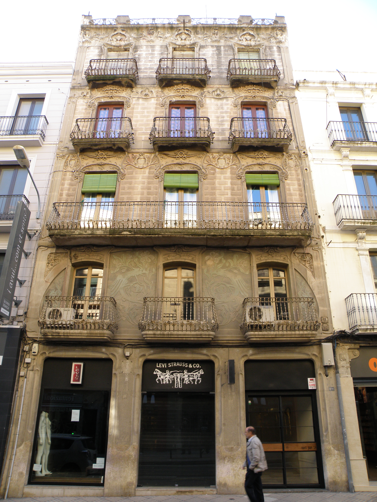 Antes de llegar a la plaza, en la citada calle, localizo dos edificios modernistas: las casas Laguna y Carpa. Ambas de Pere Caselles i Tarrats. Influenciado por Montaner,